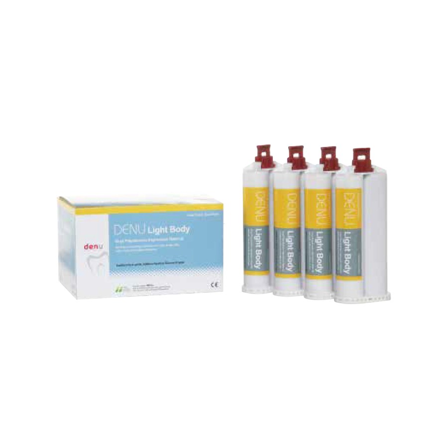 Denu Light Body is a highly flowable vinyl polysiloxane (VPS) impression material designed for capturing extremely fine dental details. It ensures precise marginal adaptation and exceptional surface reproduction, making it ideal for crowns, bridges, and inlays. Its smooth consistency allows for easy application into sulcus areas without air entrapment. The material exhibits excellent dimensional stability and tear resistance, ensuring accurate impressions for lab work. Light Body can be used in combination with Heavy Body materials for dual-viscosity techniques. Its fast setting and reliable flow improve chairside efficiency. Compatible with both cartridge and tube formats, it adapts to any clinical workflow. It minimizes patient discomfort due to its gentle texture. Suitable for both anterior and posterior applications. Delivers consistent results even in challenging clinical situations