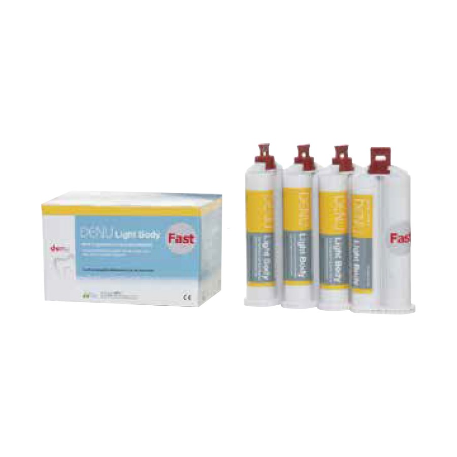 Denu Light Body Cartridge is the preloaded version of the light body VPS material for automatic mixing systems. It provides consistent ratios of base and catalyst, ensuring uniform material properties every time. Cartridges reduce waste and improve speed during chairside procedures. Ideal for dual-viscosity techniques, it flows easily into fine sulcus areas, capturing intricate details. It minimizes air bubbles and eliminates inconsistencies caused by manual mixing. The material offers excellent dimensional stability and tear resistance. Compatible with auto-mixing guns for precise, efficient application. Enhances workflow efficiency and reduces setup time. Maintains smooth consistency and fast set times for predictable clinical outcomes. Ensures comfort and satisfaction for both patient and dentist.